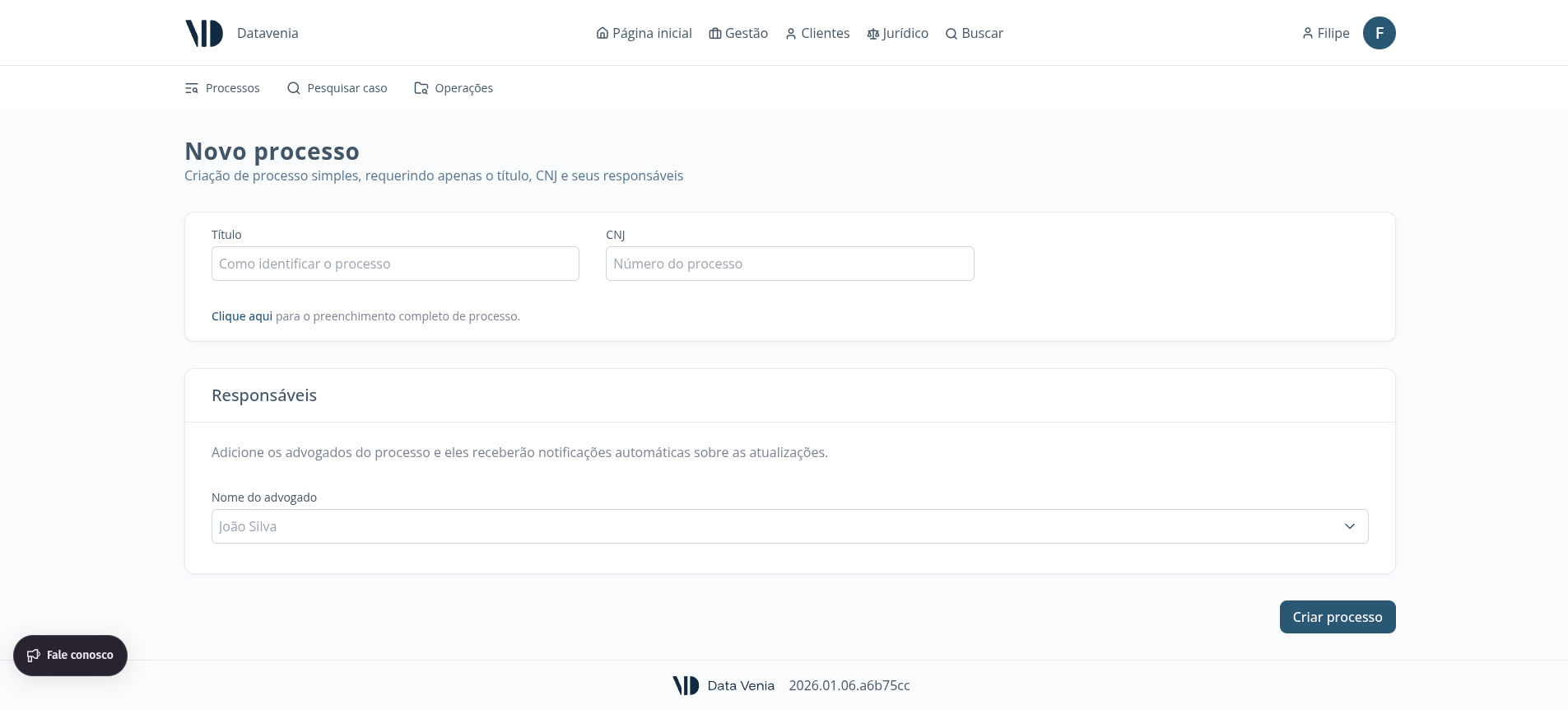 O jeito mais rápido de cadastrar um processo é informando apenas o número CNJ. O sistema busca automaticamente todos os dados no tribunal.